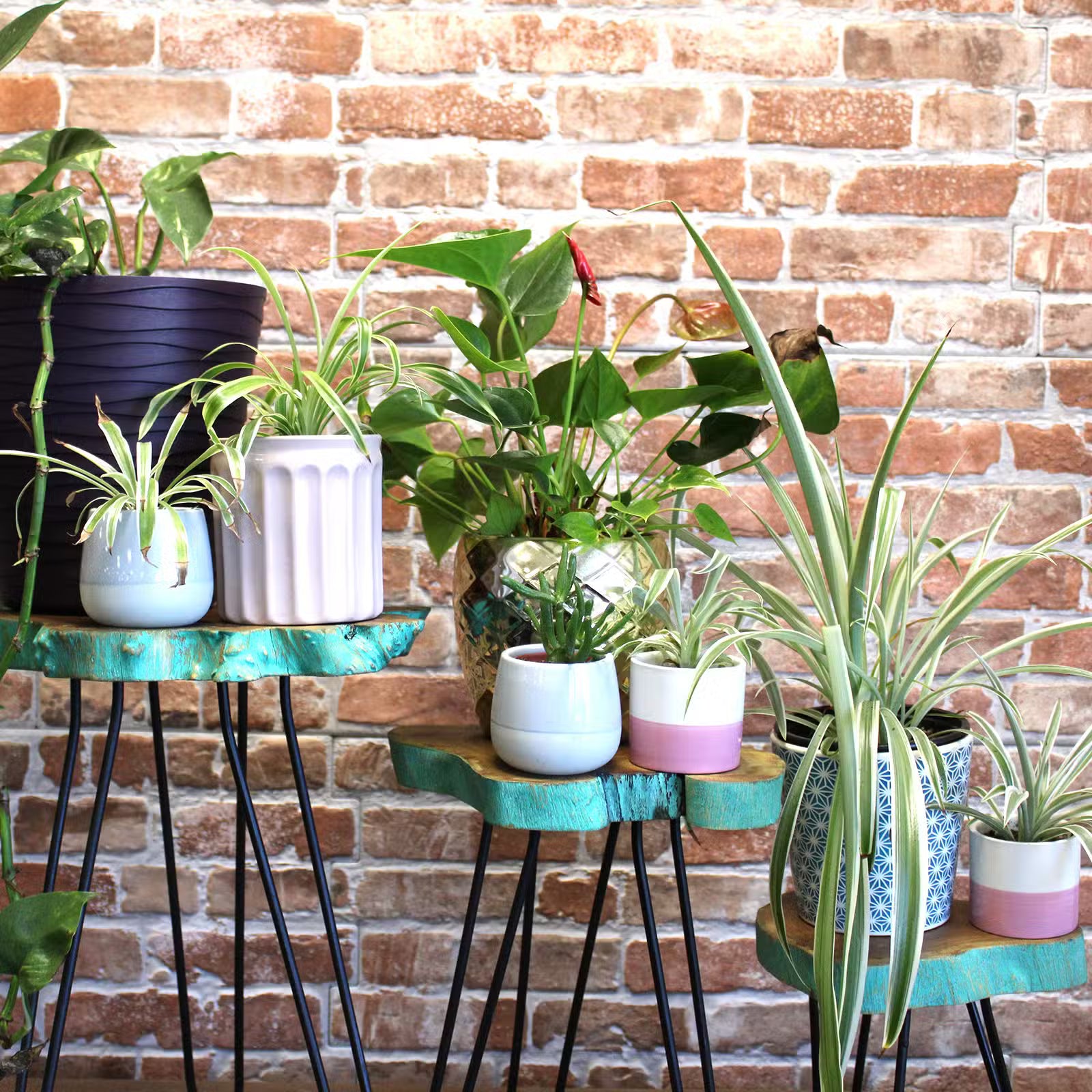 Lot de 3 supports à plantes en bois massif avec pieds en épingle à cheveux, Fabrication en Indonésie. Ces supports polyvalents peuvent également servir de tables d'appoint pour créer un coin végétal unique.